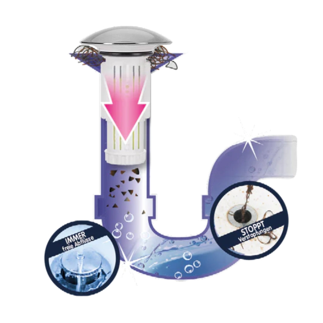 Die Steine geben bei Kontakt mit Wasser einen Wirkstoff frei, der wie ein Gleitmittel agiert. Dieser Wirkstoff sorgt dafür, dass Haare, Seifenreste und andere potenzielle Verstopfungsursachen durch den Siphon gespült werden, ohne sich abzulagern. Dadurch wird das Risiko von Verstopfungen deutlich reduziert.